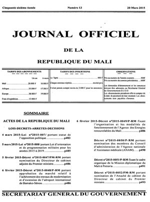 - Décret n°2015-0049/P-RM fixant l’organisation et les modalités de